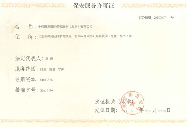 中保國衛(wèi)國際保安服務(北京)有限公司,屬中保國衛(wèi)集團旗下子公司。能全方位的為大型客戶提供優(yōu)質(zhì)的安保、押運服務,是集人防和技防于一體的新型正規(guī)化綜合安保押運服務企業(yè),提供人防、物防、技防、聯(lián)網(wǎng)報*、非武裝押運等安防相關(guān)的一站式服務。